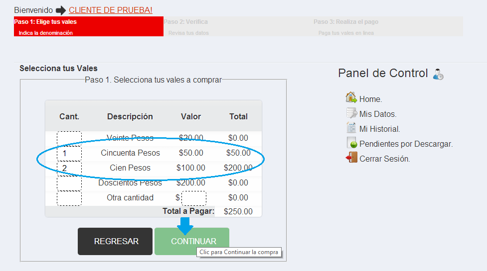 Selección de Vales: Elije la cantidad de vales que deseas comprar.