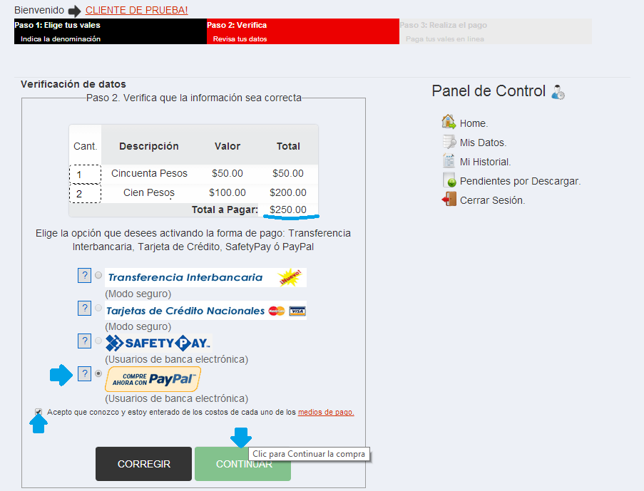 Verificación de datos: Verifiqué que los datos sea correctos y seleccione la forma de pago que desee. Para poder realizar la compra debe de aceptar los términos de condiciones.