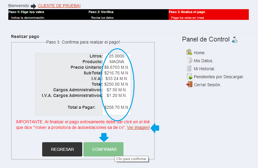 Confirmación de Pago: Se muestra los datos de la compra y los totales a pagar.